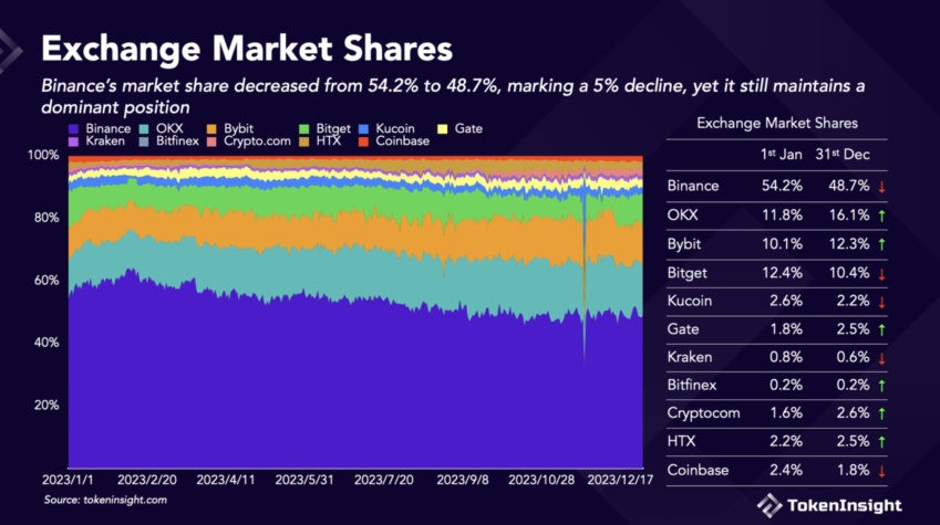 Geçtiğimiz sene ABD ve Avrupa’da bir çok soruşturmayla karşı karşıya kalan sektörün en büyük borsası Binance, 2023 yılında liderlik koltuğunu korumayı başardı. Araştırmaya göre 2022’de yüzde 54,2’lik orana sahip olan Binance’in bu sene pastadan aldığı pay yüzde 48,7’ye geriledi.