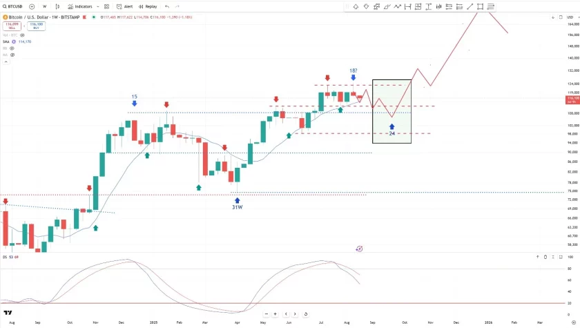 Döngüsel analize baktığımızda Bitcoin’in yukarı yönlü kırılım şansını iyi değerlendiremediğini ve güç toplamak için yeni likidite alanlarına yönelebileceğini görüyoruz. Bu analize göre Eylül ayında güç toplayıp yılın son çeyreğinde döngü tepesini görmemiz muhtemel.