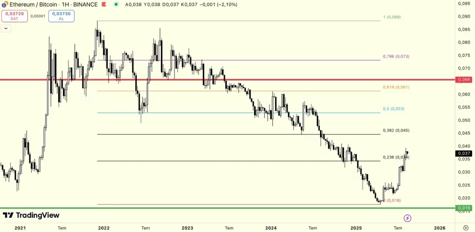 ETH / BTC grafiği hâlen güçlü görünüyor. Market bir süre güç topladıktan sonra Ethereum ve ekosisteminin tekrar momentum yakalayabileceğini, bu döngüde en azından 0,053 seviyesini görmemiz gerektiğini düşünüyorum. Eğer Bitcoin 132 bin dolar seviyesini görürse ve ETH / BTC grafiği bu bahsettiğim seviyeye ulaşırsa Ethereum 7 bin dolar seviyesine ulaşmış olacak.